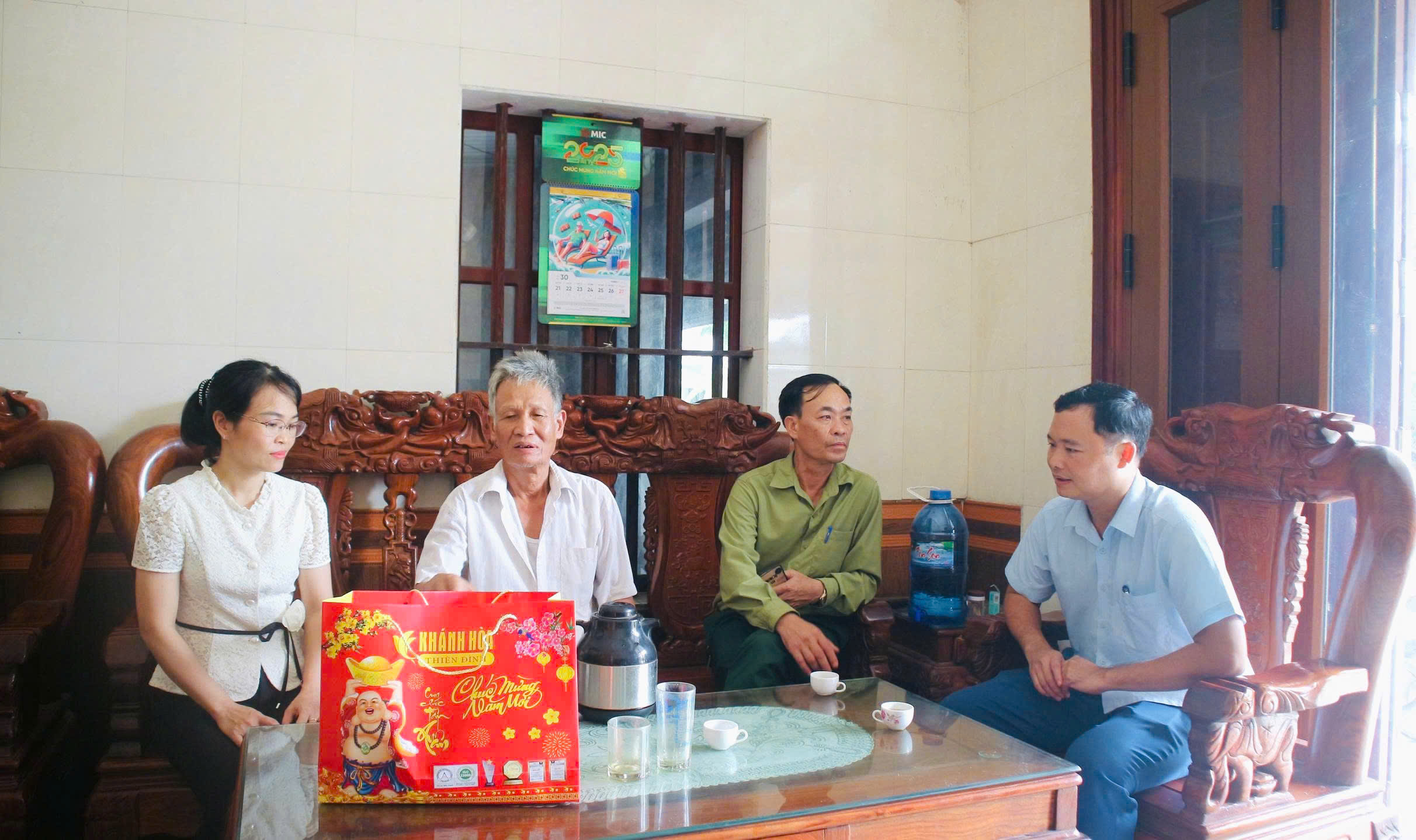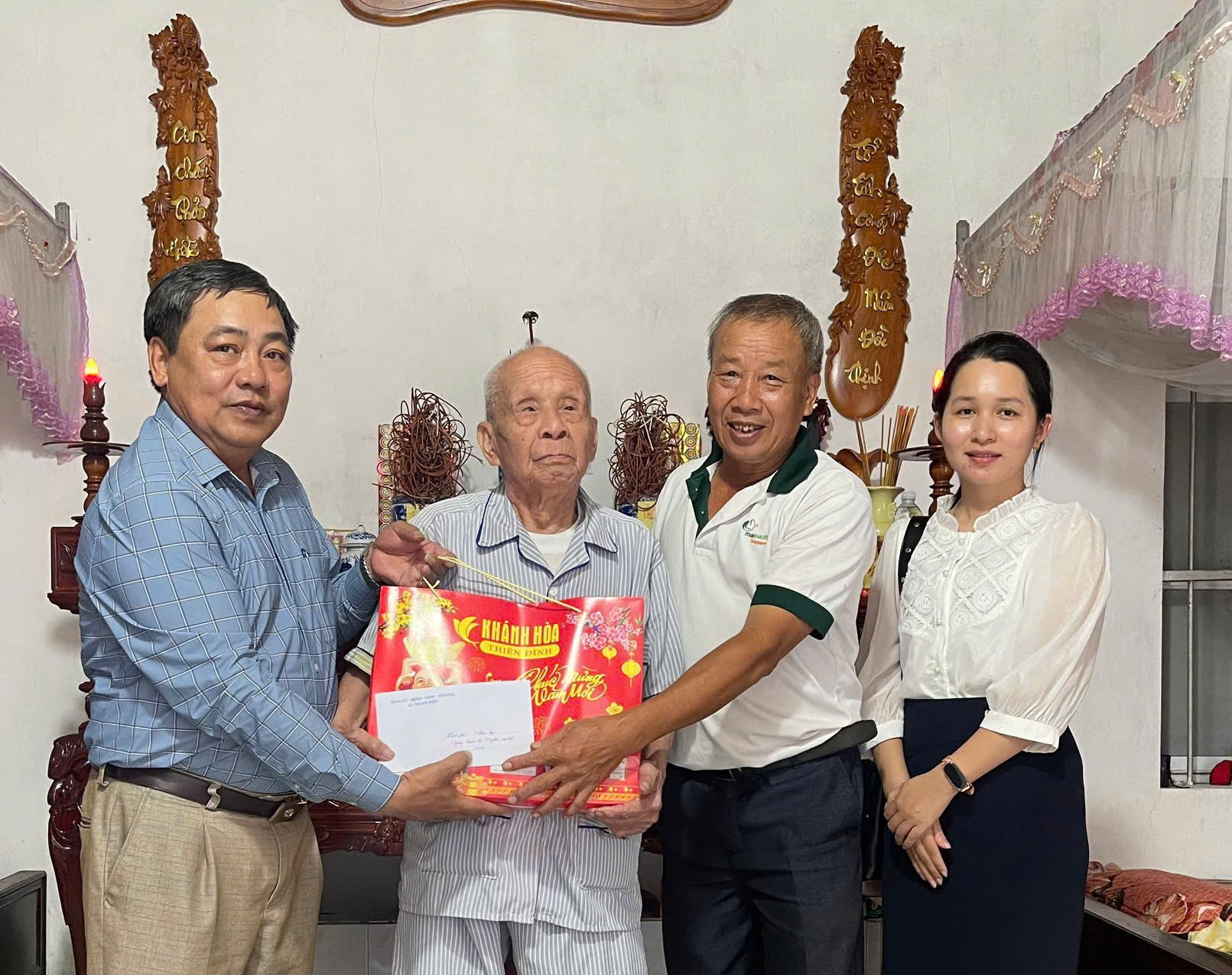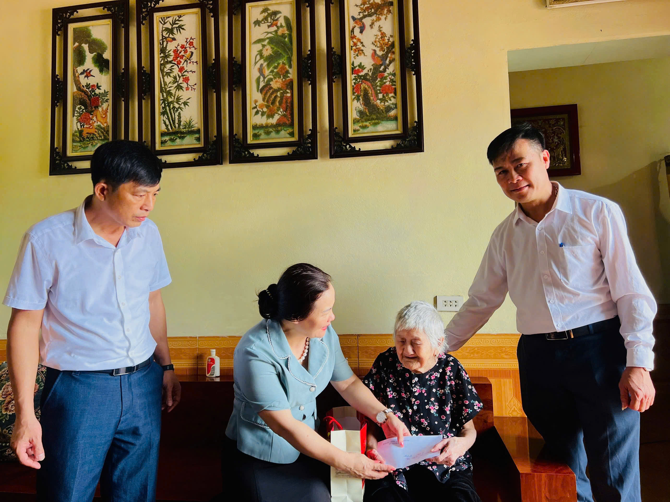 Đoàn do đồng chí Đỗ Đức Khuê – Chủ tịch UBMTTQVN xã làm trưởng đoàn, đã đến thăm và tặng quà 3 cụ: cụ Lương Văn Nhương (100 tuổi, thôn Cao Lý), cụ Bùi Thị Cúc (100 tuổi, thôn Bằng Bộ), cụ An Thị Sân (104 tuổi, thôn Gia Cốc).