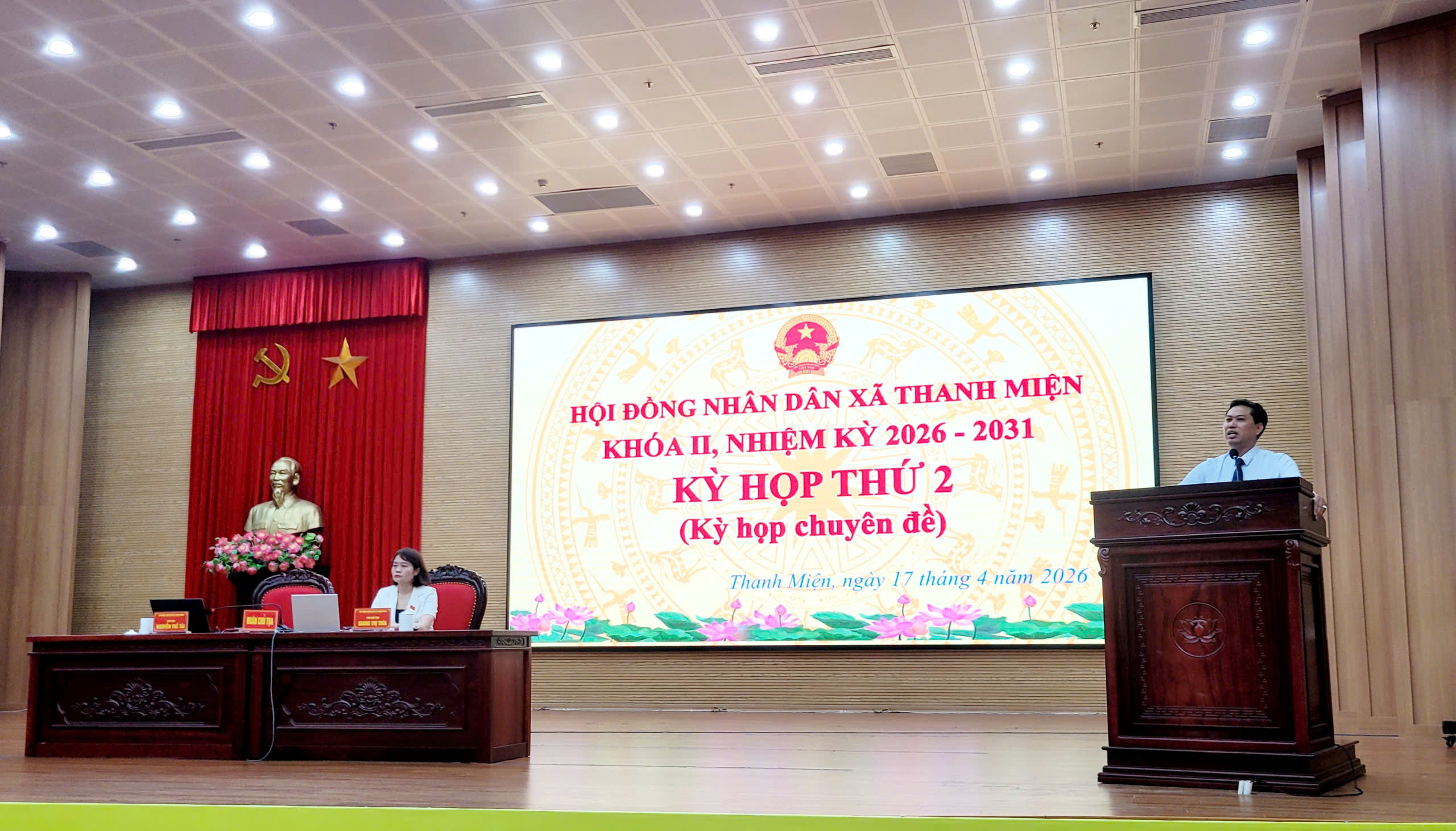 Sáng ngày 17 tháng 4 năm 2026, tại Hội trường Nhà văn hóa trung tâm xã, HĐND xã Thanh Miện khóa II, nhiệm kỳ 2026 - 2031 đã tổ chức kỳ họp thứ hai (kỳ họp chuyên đề) nhằm xem xét, quyết định các nội dung quan trọng phục vụ nhiệm vụ phát triển kinh tế - xã hội của địa phương. Dự và chỉ đạo kỳ họp có đồng chí Nguyễn Thế Tài – Bí thư Đảng ủy, Chủ tịch HĐND xã; đồng chí Vũ Minh Nguyệt – Phó Bí thư Thường trực Đảng ủy; đồng chí Nguyễn Thanh Tịnh – Phó Bí thư Đảng ủy, Chủ tịch UBND xã, cùng các đồng chí trong Ban Chấp hành Đảng bộ xã, đại biểu HĐND xã và đại diện các cơ quan, đơn vị trên địa bàn.