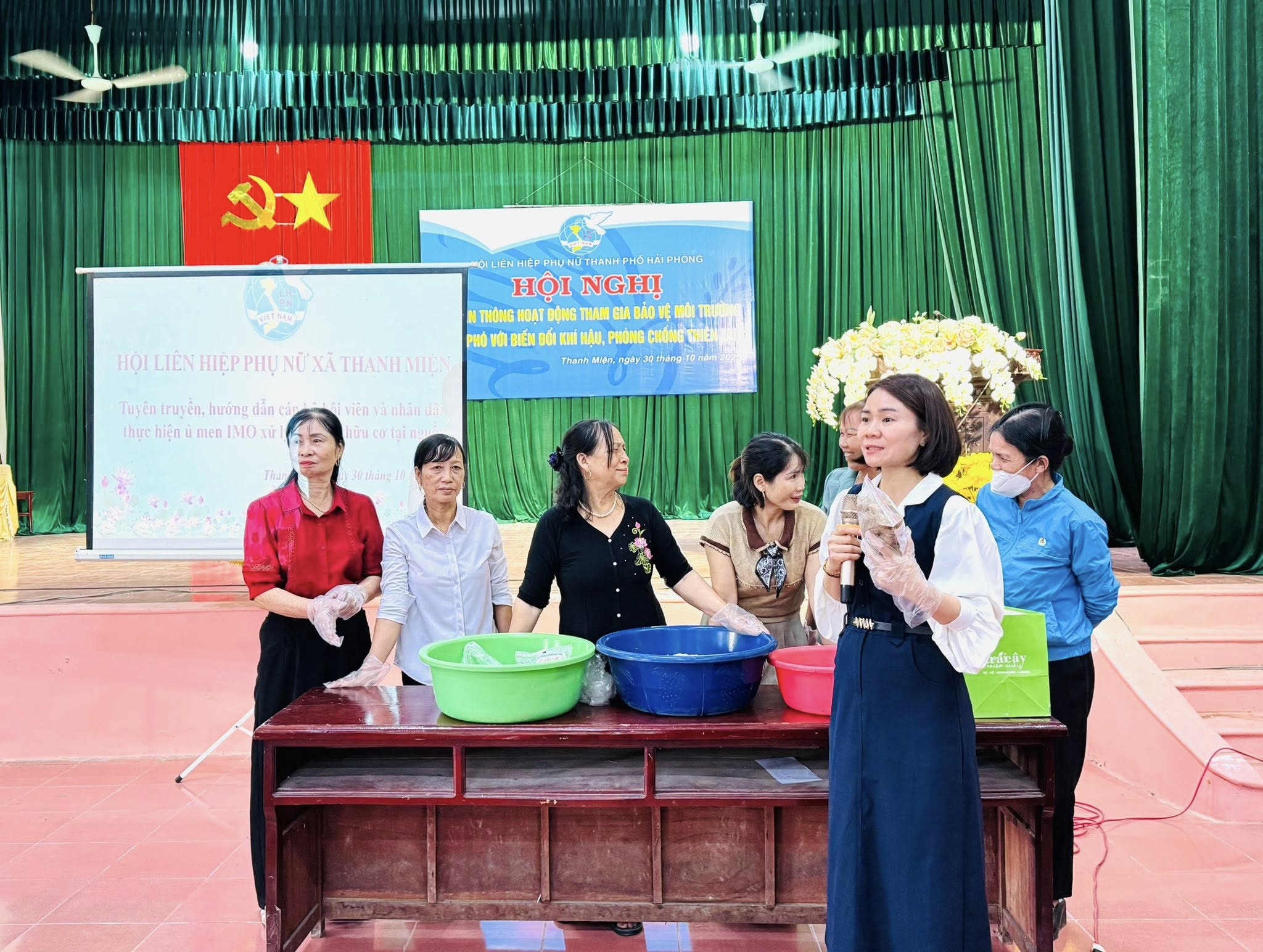 Tiếp đó, đồng chí Nguyễn Thị Sim – Chủ tịch Hội Liên hiệp Phụ nữ xã Thanh Miện đã trực tiếp hướng dẫn hội viên cách ủ men và sử dụng chế phẩm sinh học IMO trong xử lý rác thải hữu cơ tại hộ gia đình. Ngay tại hội nghị, các đại biểu được thực hành quy trình làm chế phẩm, tìm hiểu nguyên liệu, công dụng và hiệu quả của IMO trong việc giảm mùi hôi, xử lý rác thải sinh hoạt, góp phần xây dựng mô hình “Nhà tôi 3 sạch”, “Làng kiểu mẫu về bảo vệ môi trường”.
